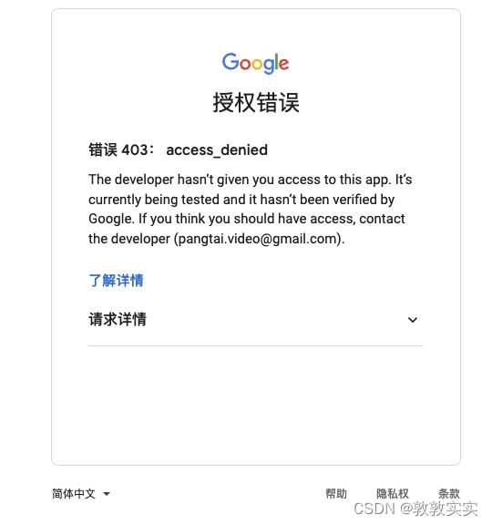 账号授权时如果出现 这种提示 则是因为 创建的应用未设置测试用户,将当前用户加入测试用户列表中即可(步骤:2.13,2.14,2.15)