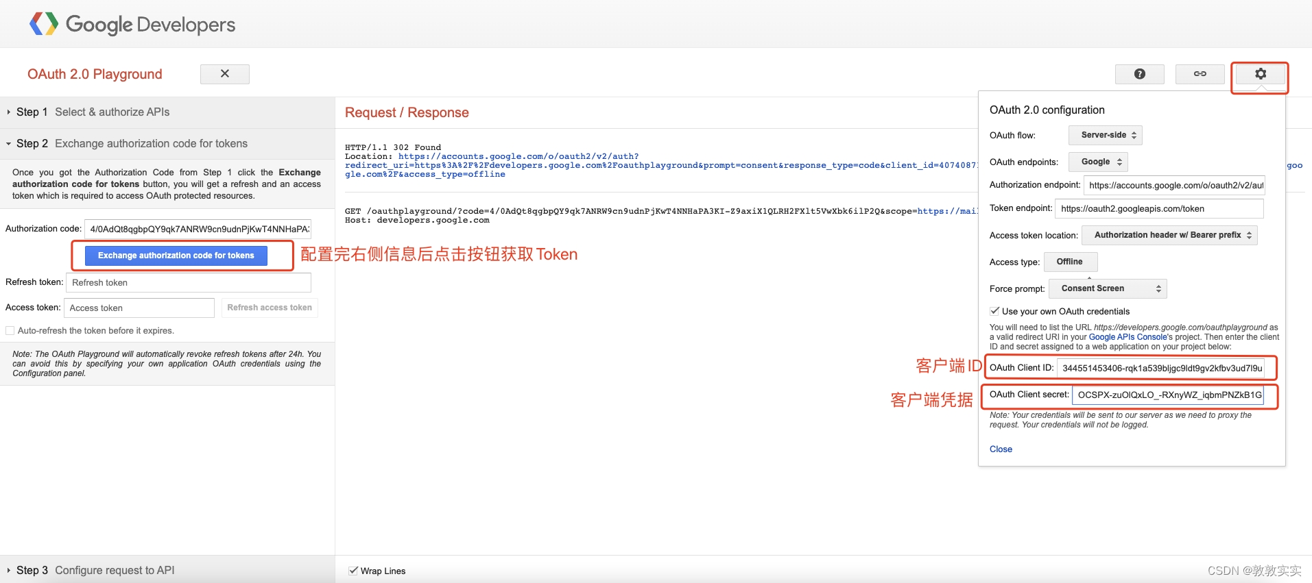 2.19同意授权后会重新回到页面 https://developers.google.com/oauthplayground 点击按钮获取Token