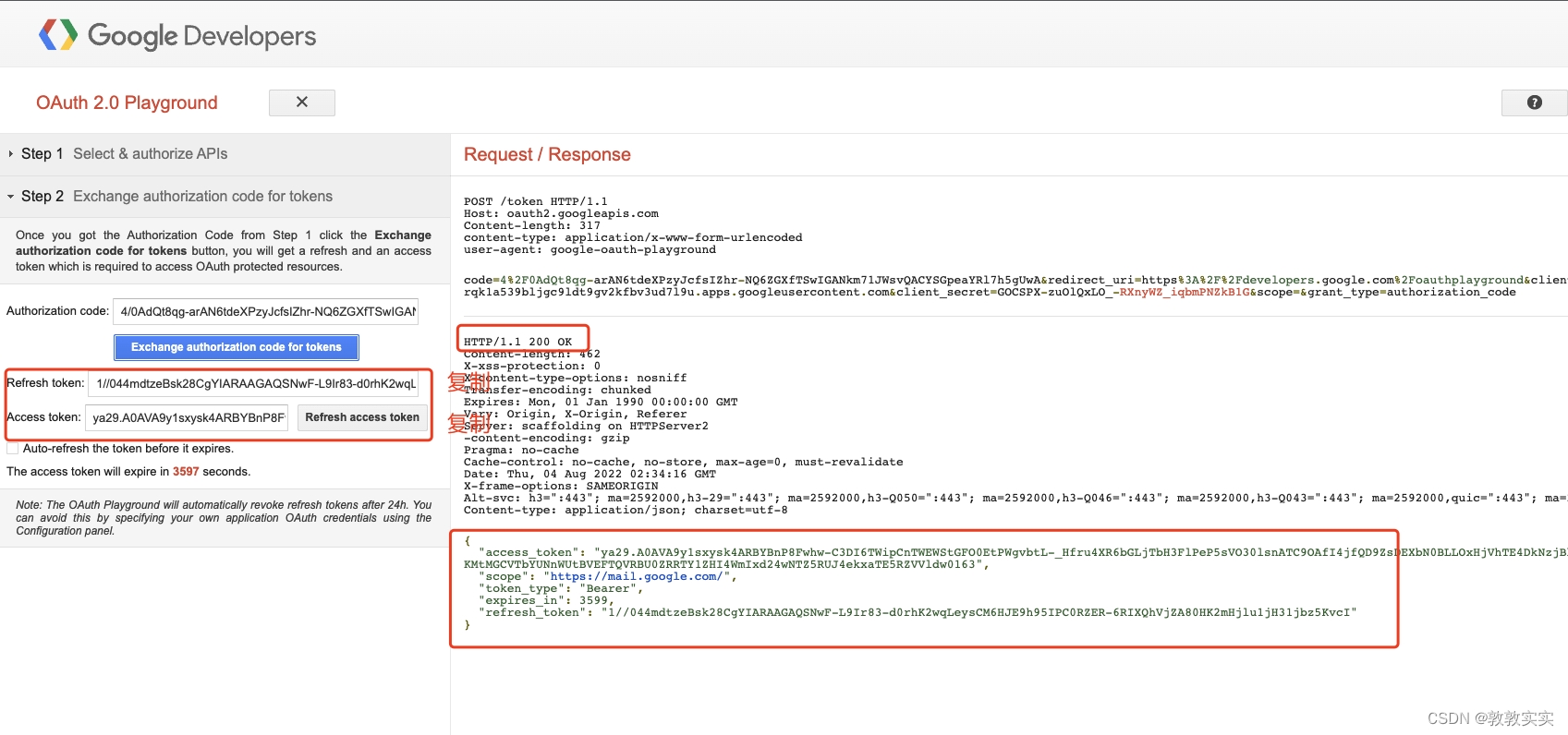 2.20判断右侧出现 HTTP/1.1 200 OK 且 相关信息都已显示,复制左侧 RefreshToken 与 Access token