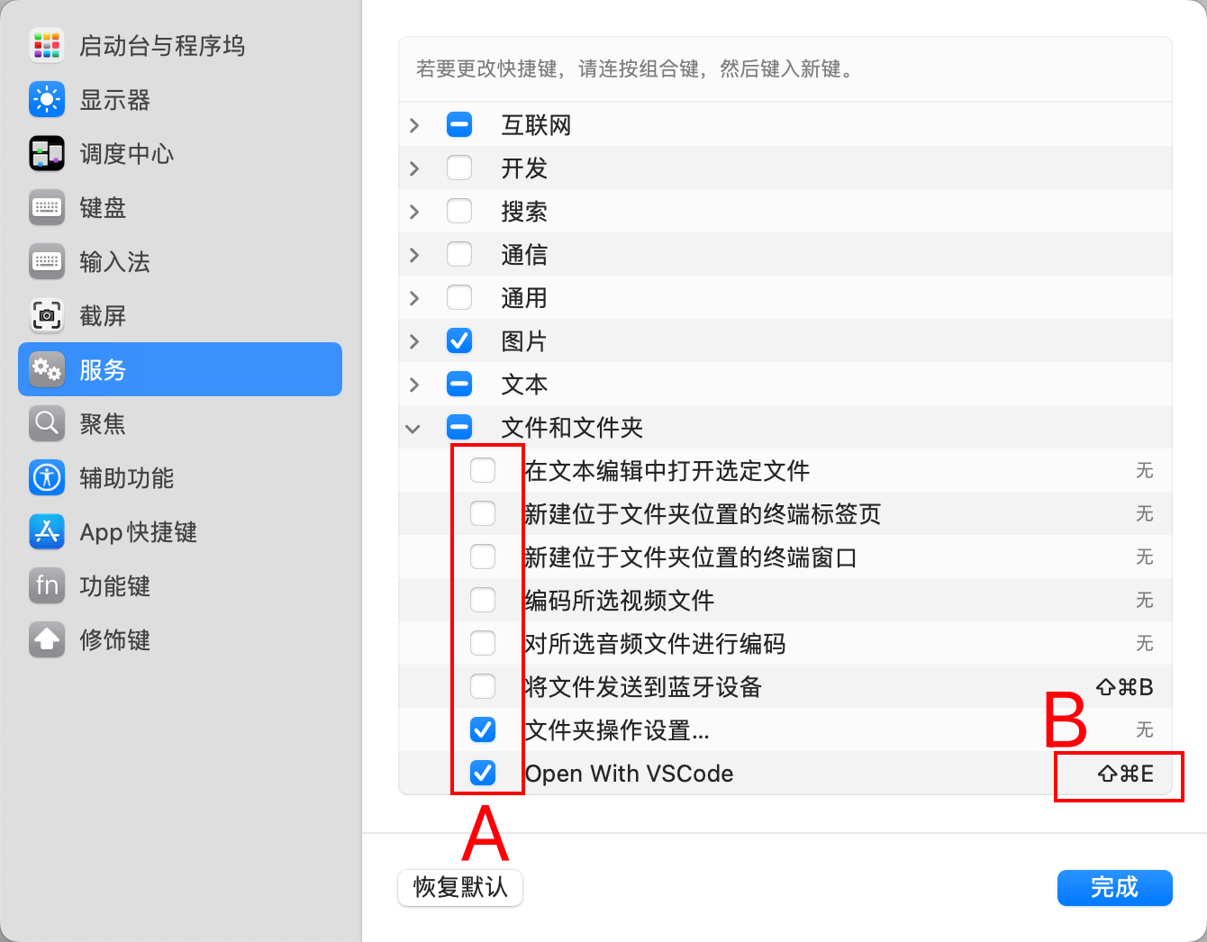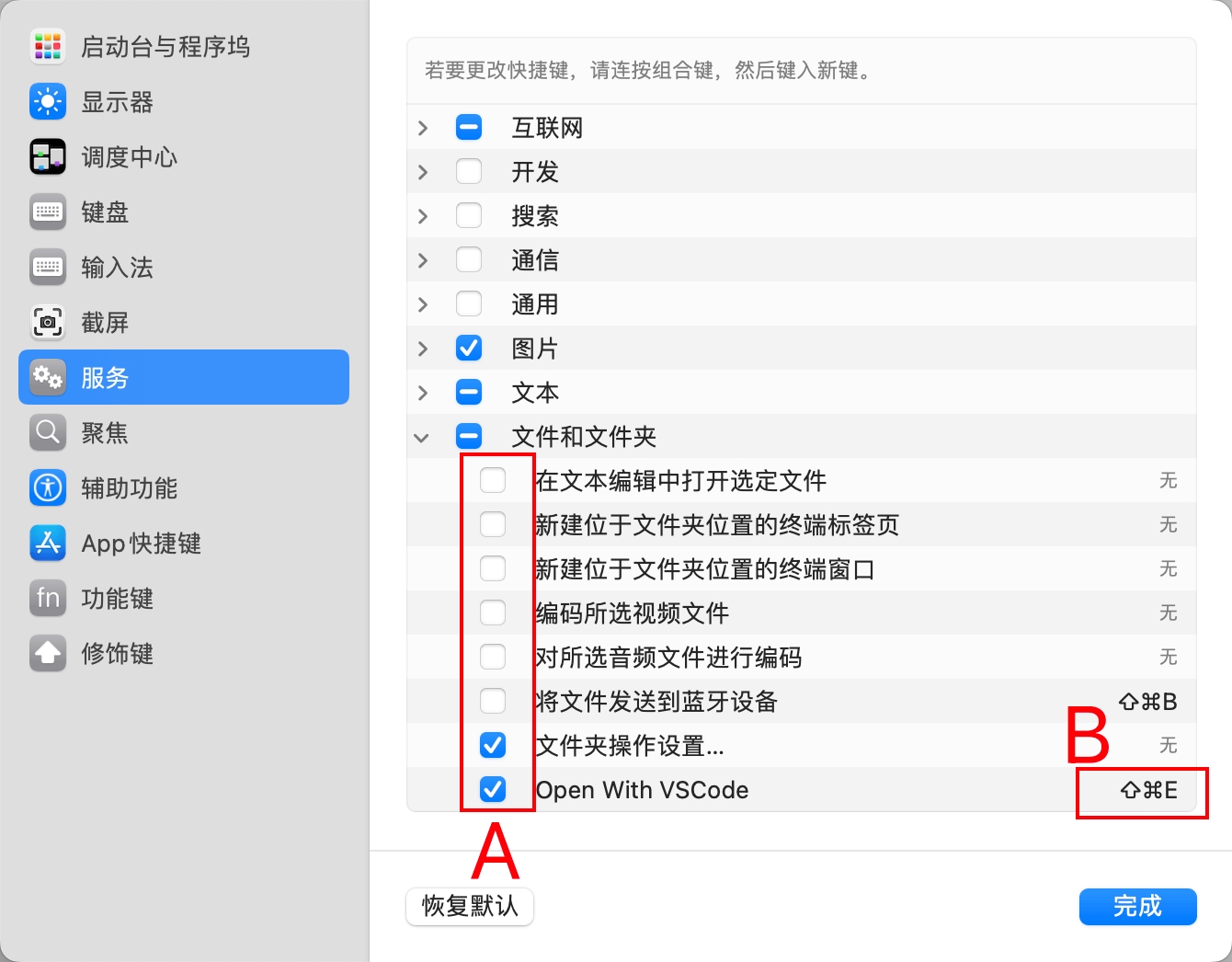8. 这可以把一些目测用不到的功能,取消勾选(A处),同时确保「Open With VSCode」是被勾选的,然后点击后面的快捷键「B处」,给这个功能设置一个快捷键,比如这里我设置的快捷键就是「command + shift + E」。