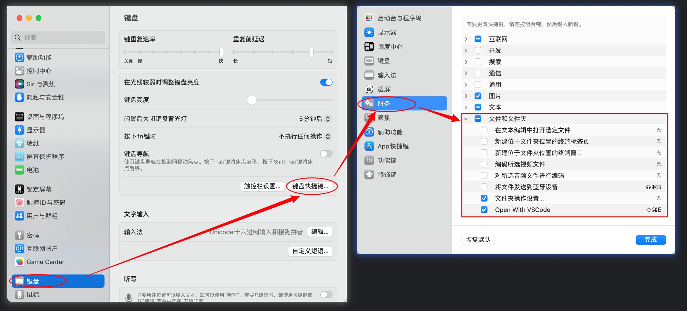 设置 Open With VSCode (在Mac上右键菜单通过Visual Studio Code打开文件夹)。
