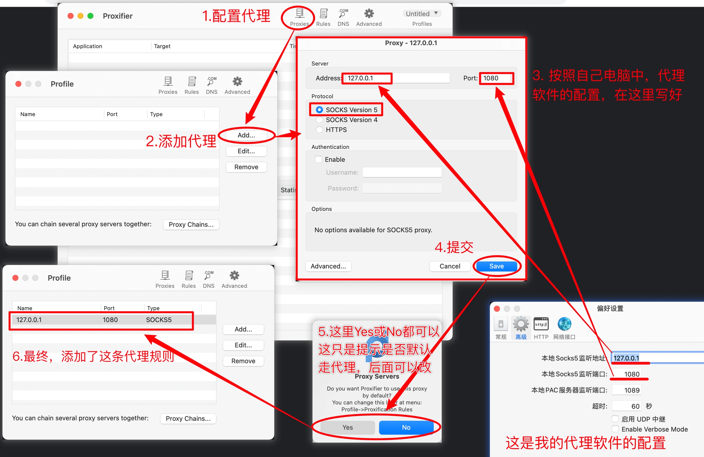 此时需要按照下图所示的步骤,给 Proxifier 添加代理目标,在 Proxifier 中走代理的请求,会被重定向到这个地址:端口,其实也就是 TrojanX 监听的那个地址:端口。