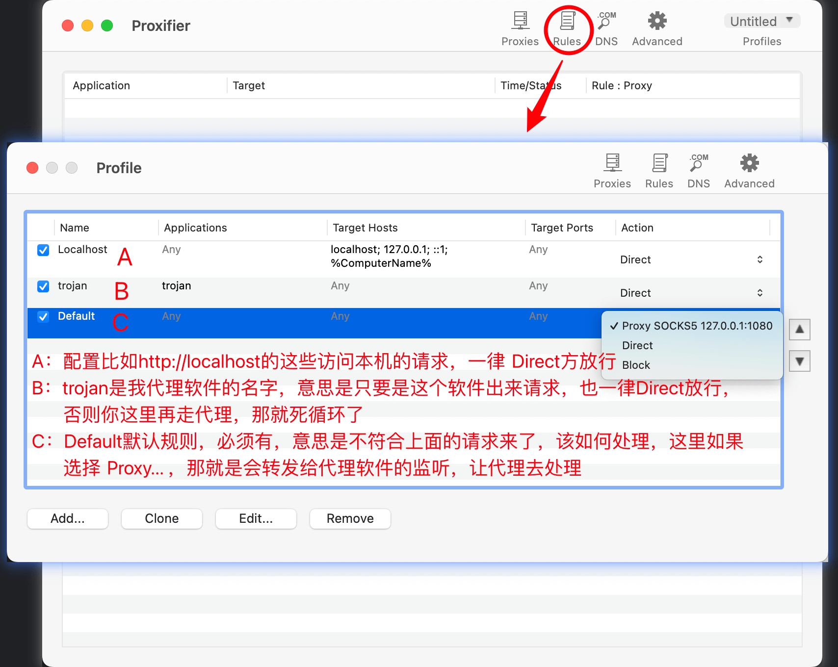 Name:自定义的规则名称;Applications:软件名称,这个软件发出的请求,走这条规则(不写就是Any了);Target Hosts:ip地址,访问这个ip的请求,走这条规则(不写就是Any了);Target Ports:端口好,请求访问的是这个端口号的,走这条规则(不写就是Any了);Action:此规则的Profile处理方案:Direct:假装Proxifier不存在,直接放走这个请求;Block:拦截,直接把这个请求摁死,被proxifier卡死,发不出去了;Proxy ...:配置的代理方案,也就是上一步配置的那个,会把走这条规则的请求转发过去。