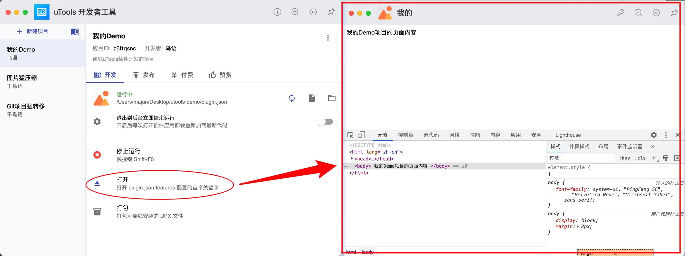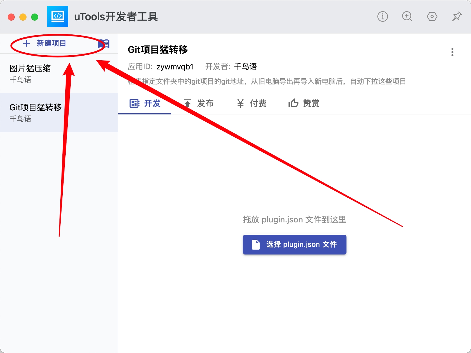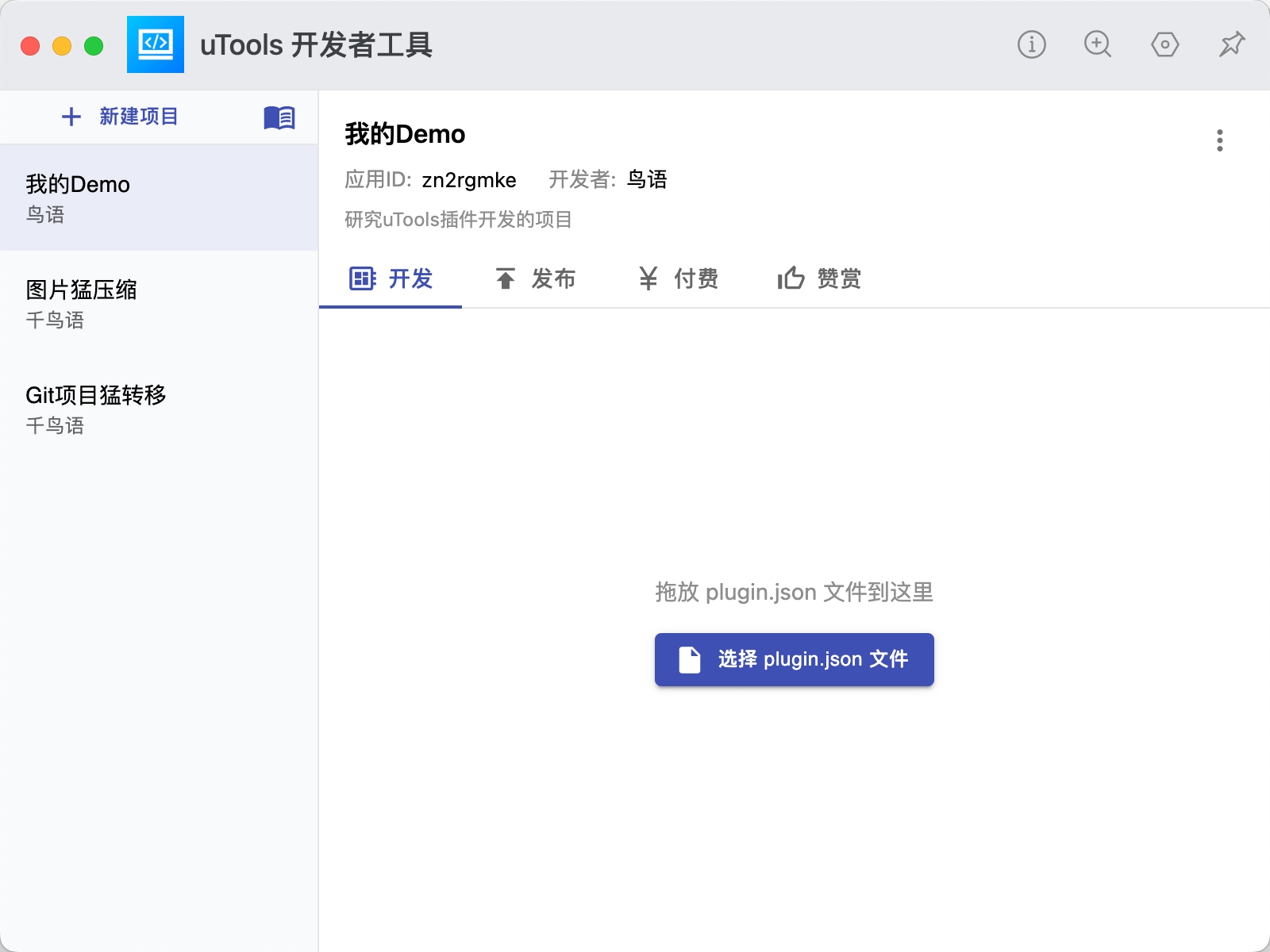 在uTools中创建了项目,就差一个plugin.json文件就可以运行、发布了,**plugin.json **文件所在的文件夹,就是我们插件代码的项目文件夹。