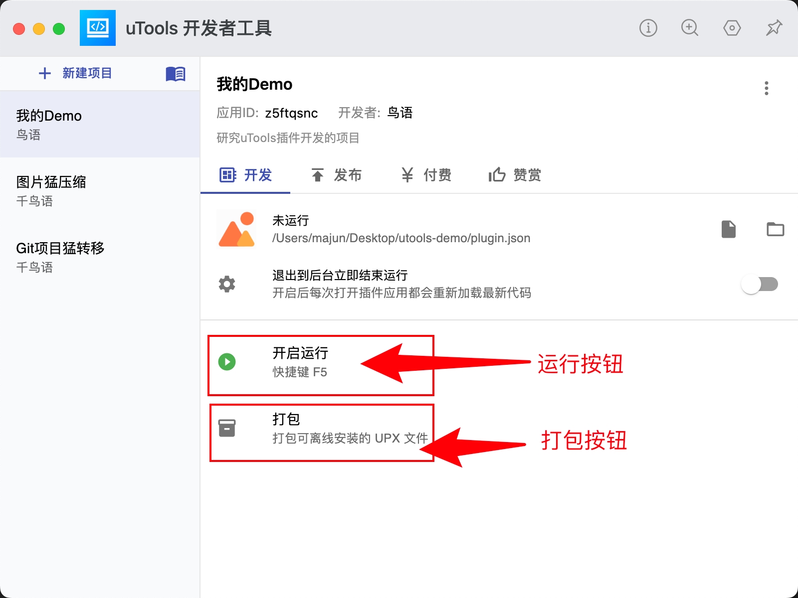 这里简单说明一下打包项目,点击打包项目,会把本插件的项目文件夹进行打包,其实就是压缩生成一个 upx 格式的文件,这个文件就是可供uTools运行的插件包。