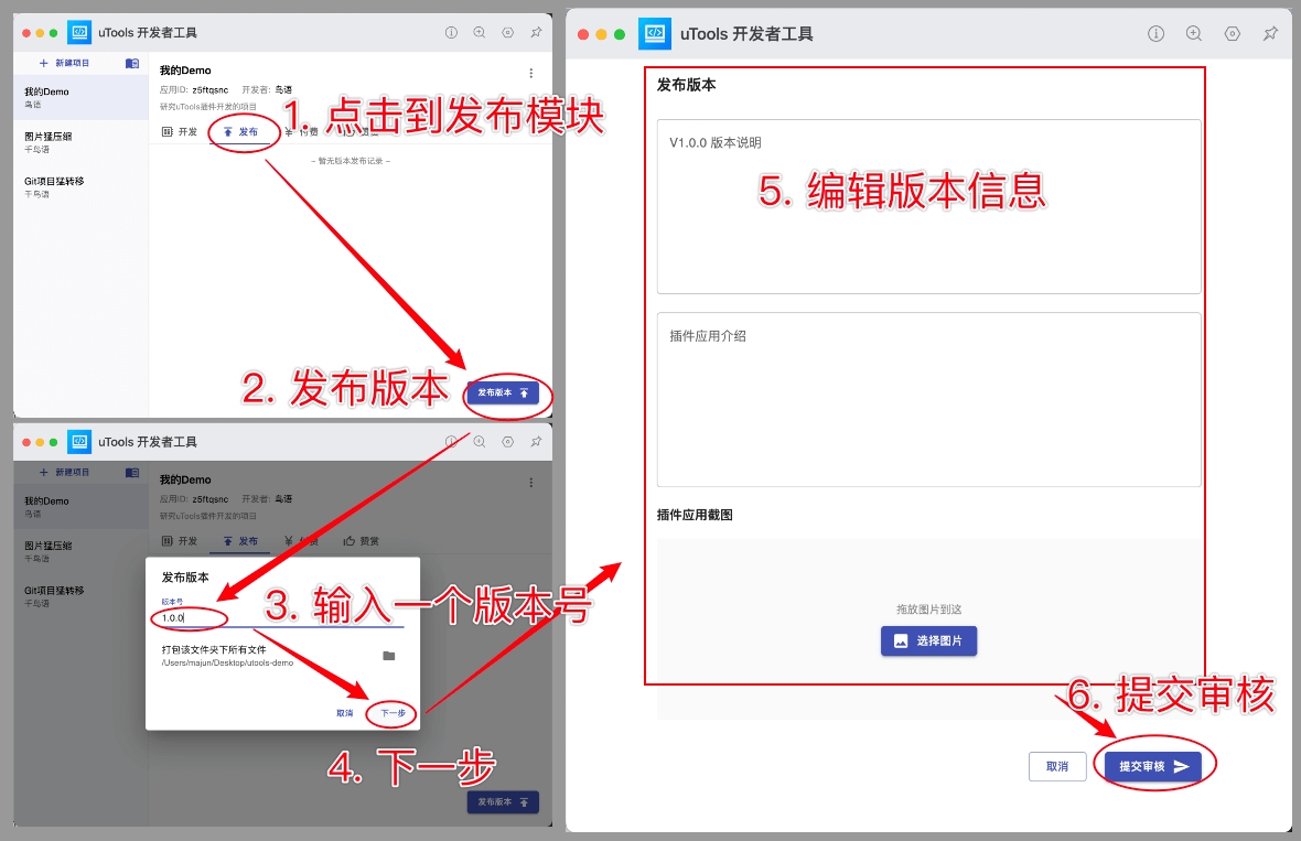 **强烈建议:**如果是新插件,在发布之前,最好先自己打包一下,打包出upx文件,自己安装一下使用一下,以免某些配置、环境、路径问题,导致正式环境下插件不可用。